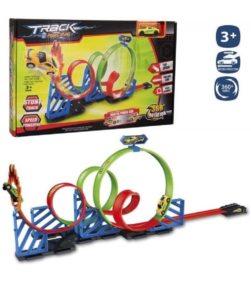 Pista looping con 4 giros. Incluye 1 coche de retro-friccion.