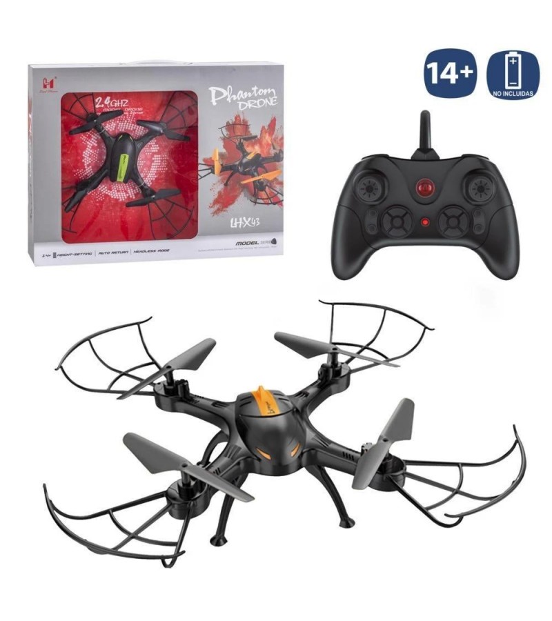 Dron PHANTOM de radio control. Dron de batería con cable USB con una duracion de 1 hora y 15 minutos aproximadamente. El mando funcionaria con 3 pilas AAA