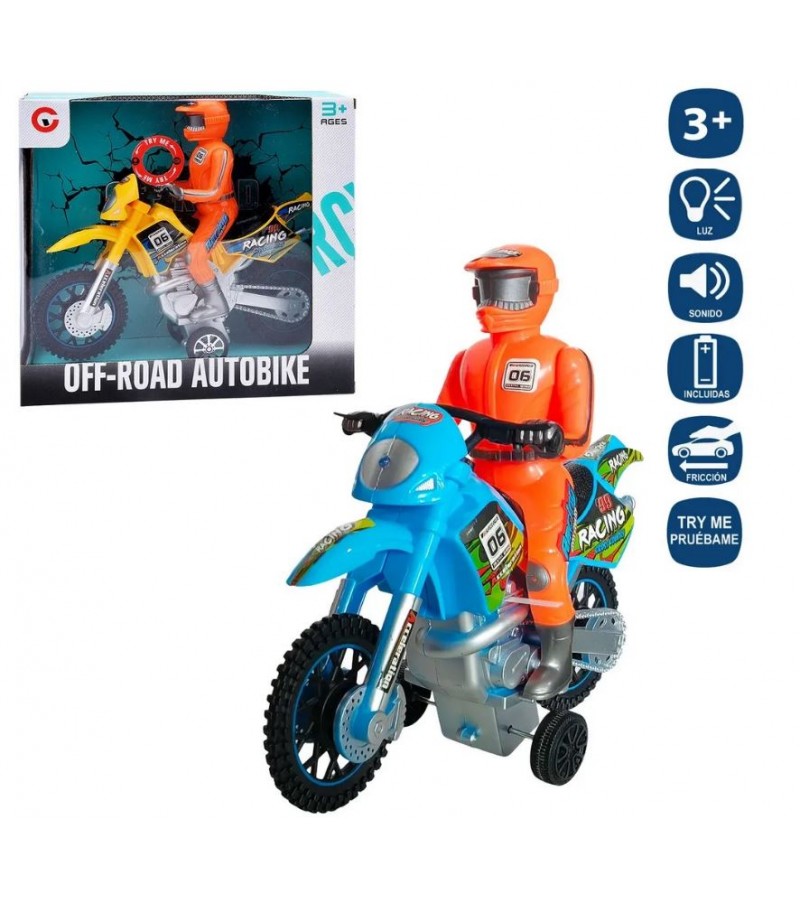 Moto cross de friccion con luz y sonido. Disponible en dos colores, sujetos a disponibilidad.