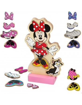 Juego magnetico de vestidos de madera, para que le pongas tu look favorito a minnie. Incluye 38 piezas.