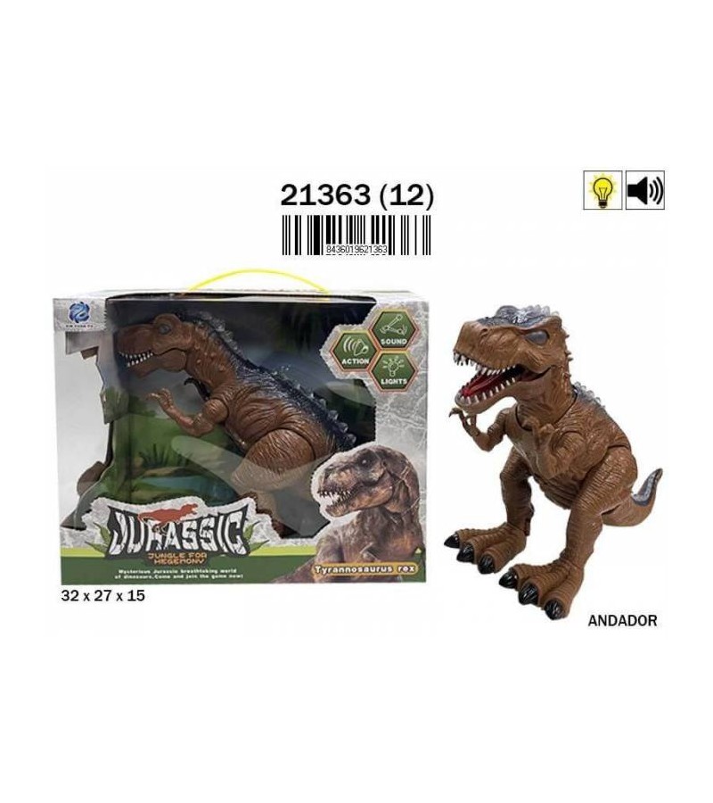 Dinosaurio de 40cm, camina hacia delante con luz y sonidos. Dos colores surtidos, verde o marron, sujetos a disponibilidad.