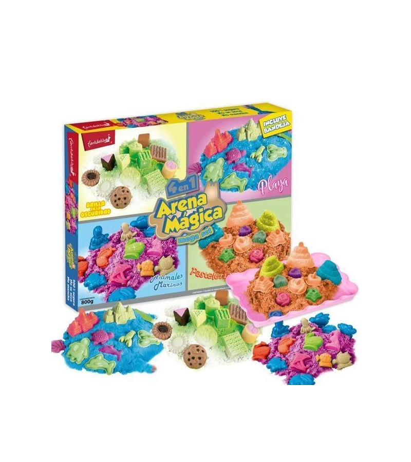 Arena magica 4 en 1. Contiene 800gr de arena magina y una bandeja para que los mas pequeños puedan realizar lo que se imaginen con sus accesorios.
