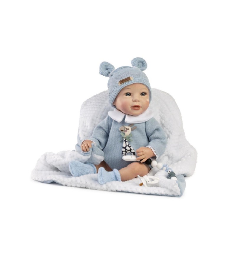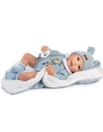 Muñeco reborn prematuro Samuel con pelele de lana azul. Medida aproximado del muñeco: 38cm